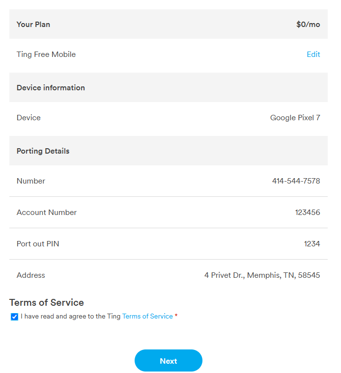 7. If you're bringing your number to Ting, enter your details for your current carrier in the form.