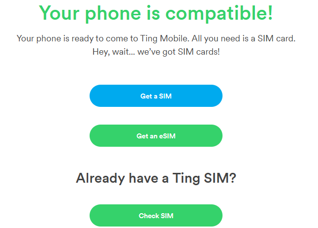 4. If you’re using eSIM, select Get eSIM. If you have a physical Ting SIM, select Check SIM and enter your SIM card number. Need to order a physical SIM? Select Get a SIM.