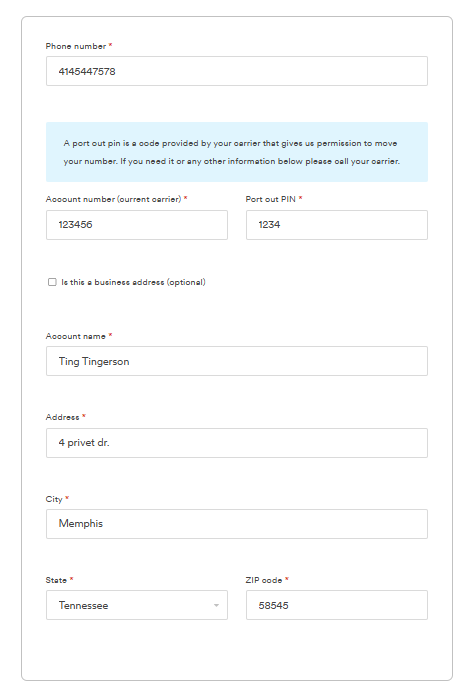 10. If you're bringing your number to Ting, enter your details for your current carrier in the form.