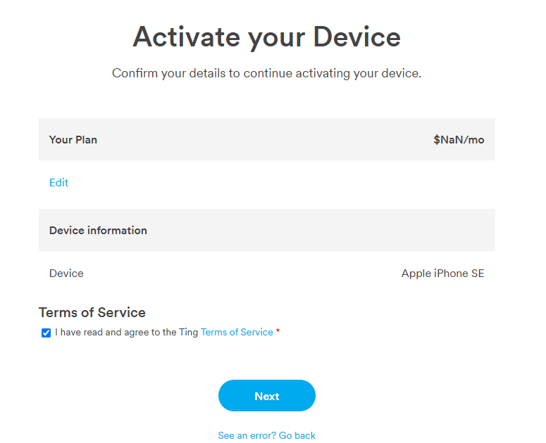 8. Review your activation details. If everything looks good, review the terms of service and select Next.