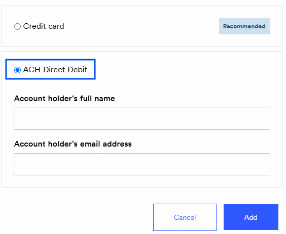 4. In the pop-up, scroll down to choose ACH Direct Debit by selecting the radio button.